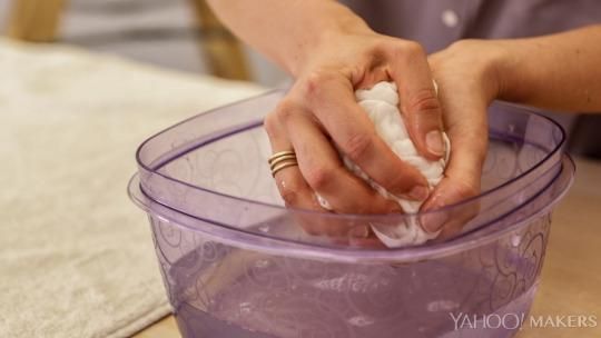 3. حوله تمیز را بر روی سطح کار خود قرار دهید. به آرامی آب اضافی را از تیشرت فشار داده و آن را روی حوله قرار دهید.